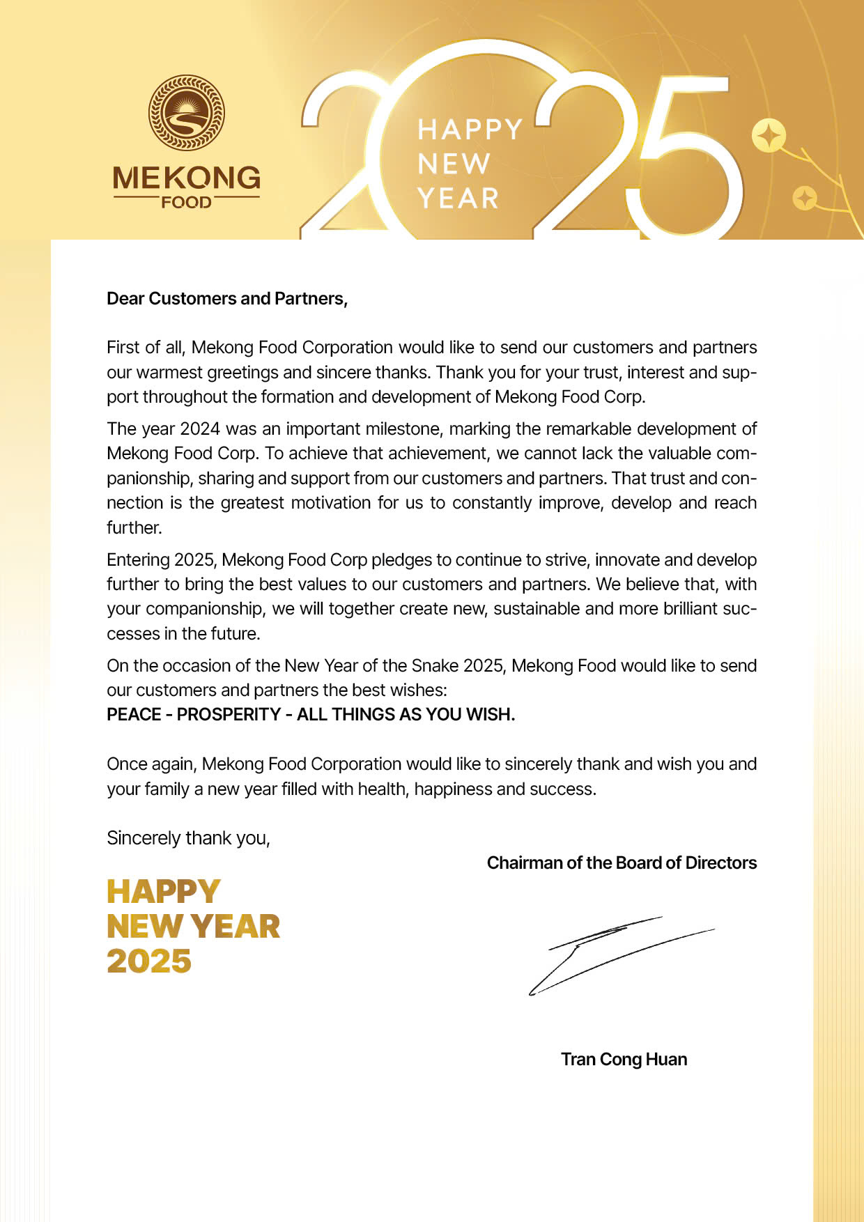 On the auspicious occasion of the New Year 2025, Mekong Group wishes to extend our deepest gratitude to our esteemed Customers and Partners for your unwavering trust, support, and invaluable companionship over the past year.
